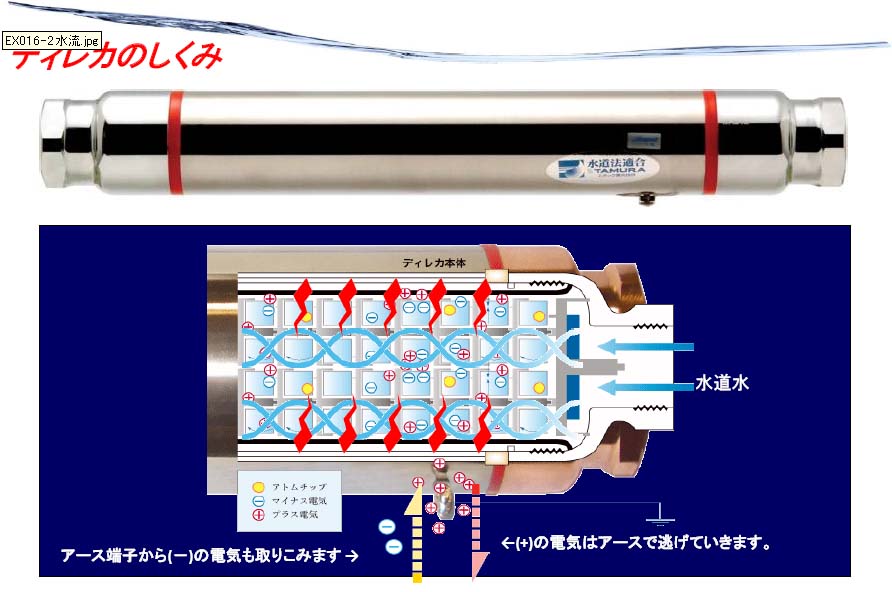 [回答]ディレカパイプの中の構造が特殊な水流を作り出し、滅菌しているようです。また、マイナス電荷環境をある種の細菌が嫌がるようです。井戸水を塩素消毒する必要がなくなった食品製造工場もあります。