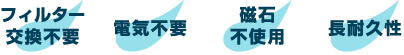 磁石、電気を使用していないので安心して使用いただけます。フィルターによる水の劣化(酸化)がありません。銀や中空糸の可塑剤が溶け出す心配がありません。セラミックが溶け出す心配もありません。